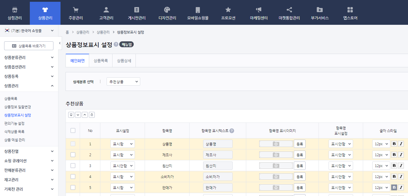 상품관리 - 상품정보표시 등으로 들어가봤지만...